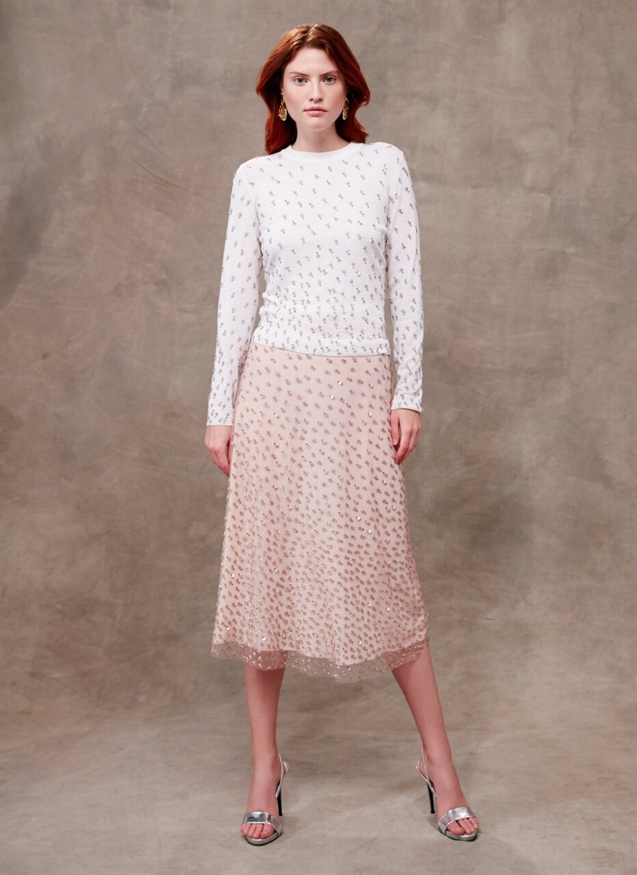 Escada Boncuk İşlemeli Tül Detaylı Midi Boy Pudra Etek (1025033671)
