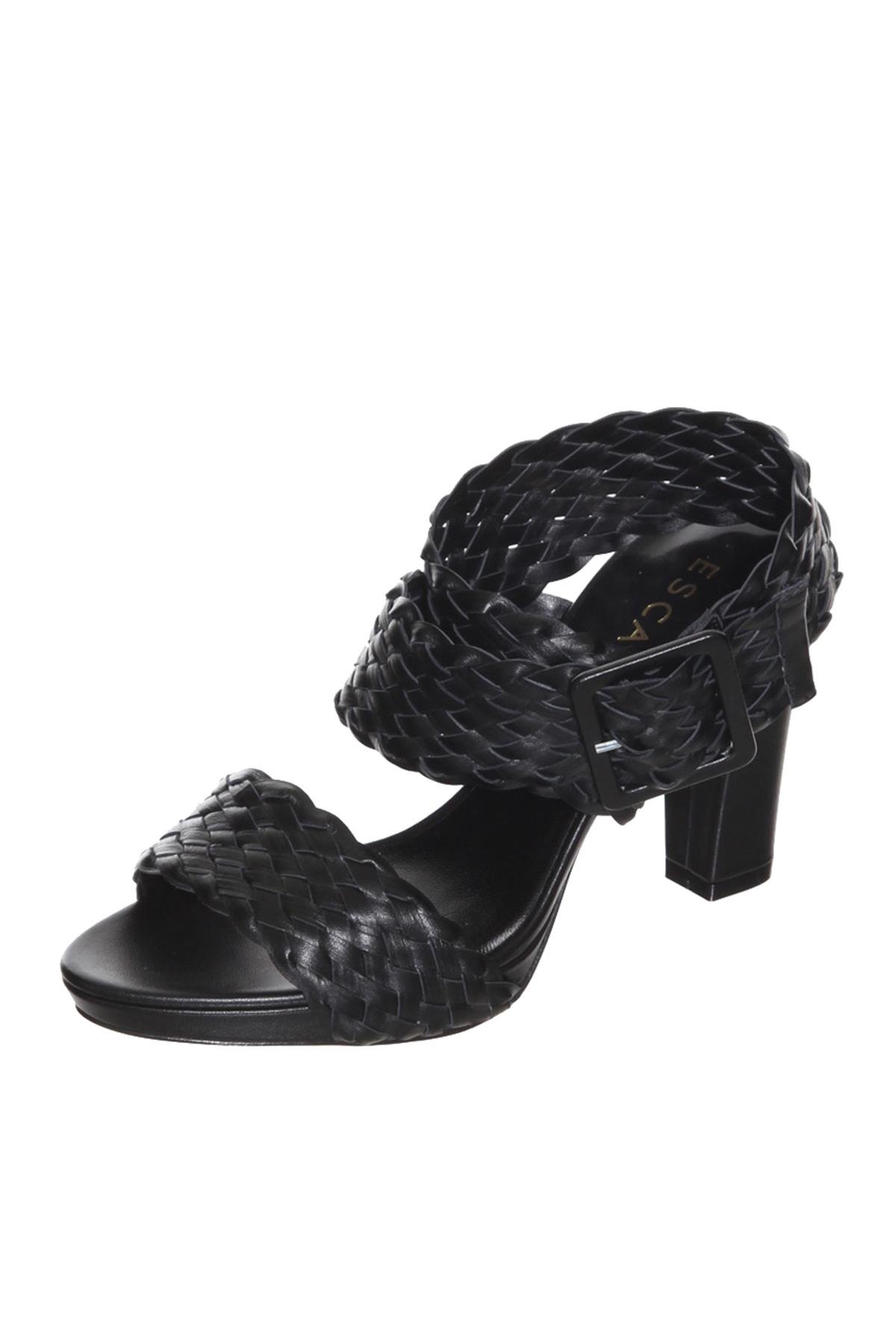 Escada  Örgü Detaylı Kemerli Kalın Topuklu Siyah Deri Ayakkabı